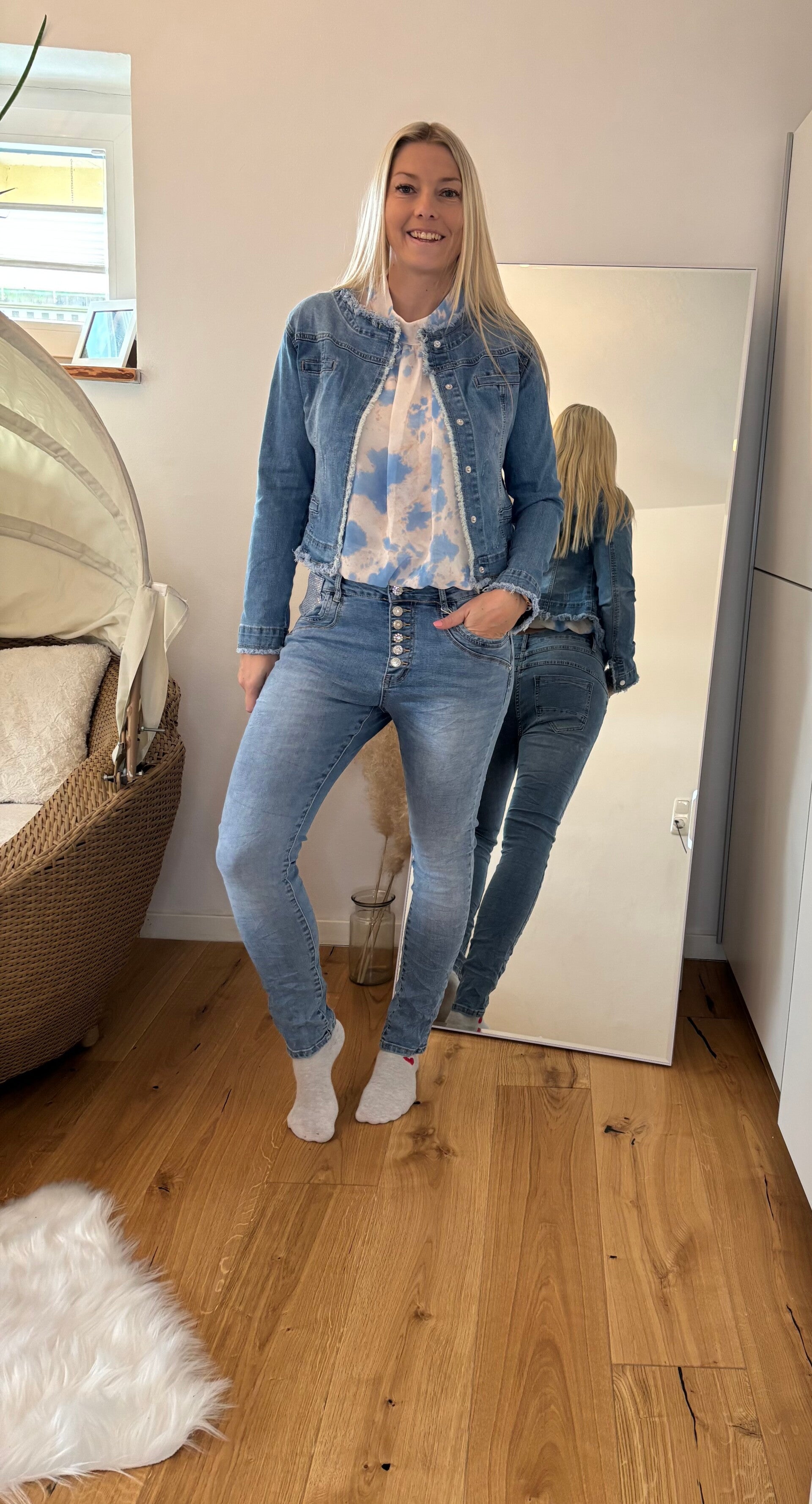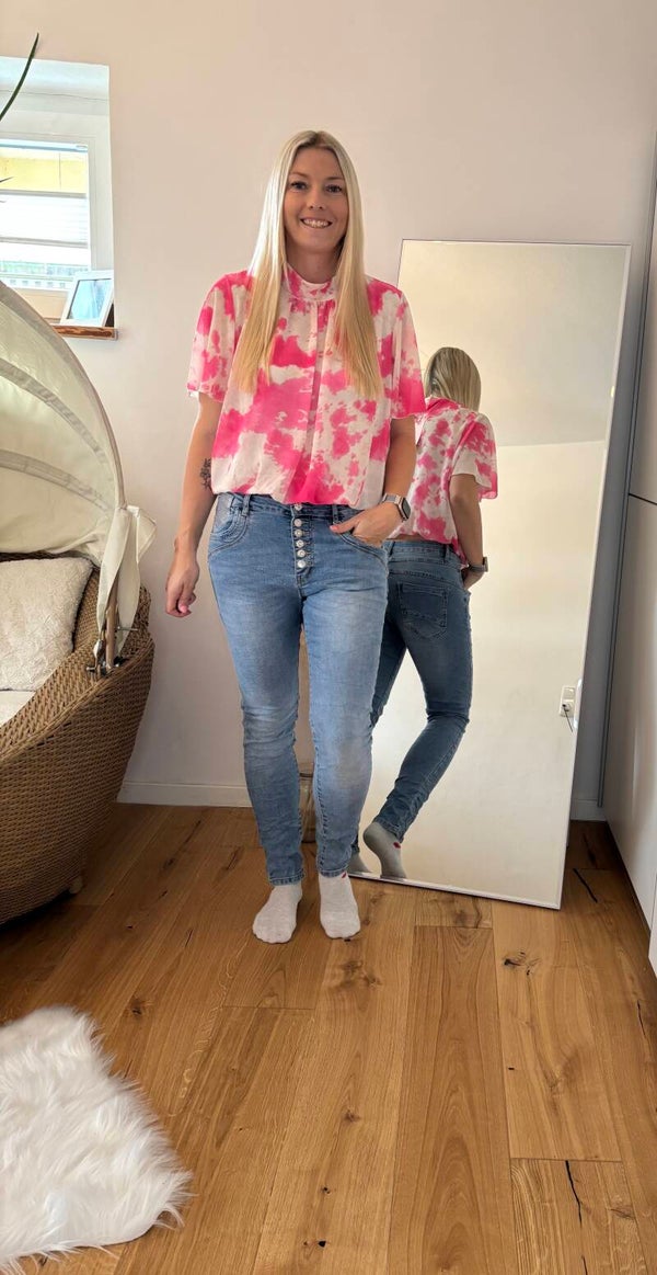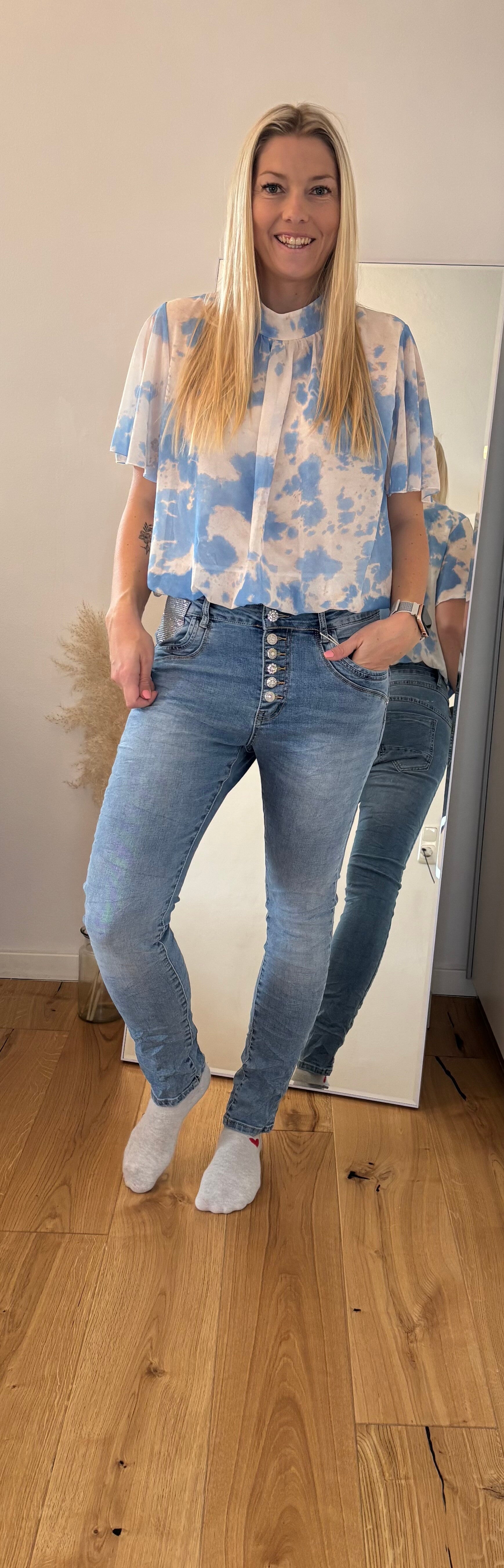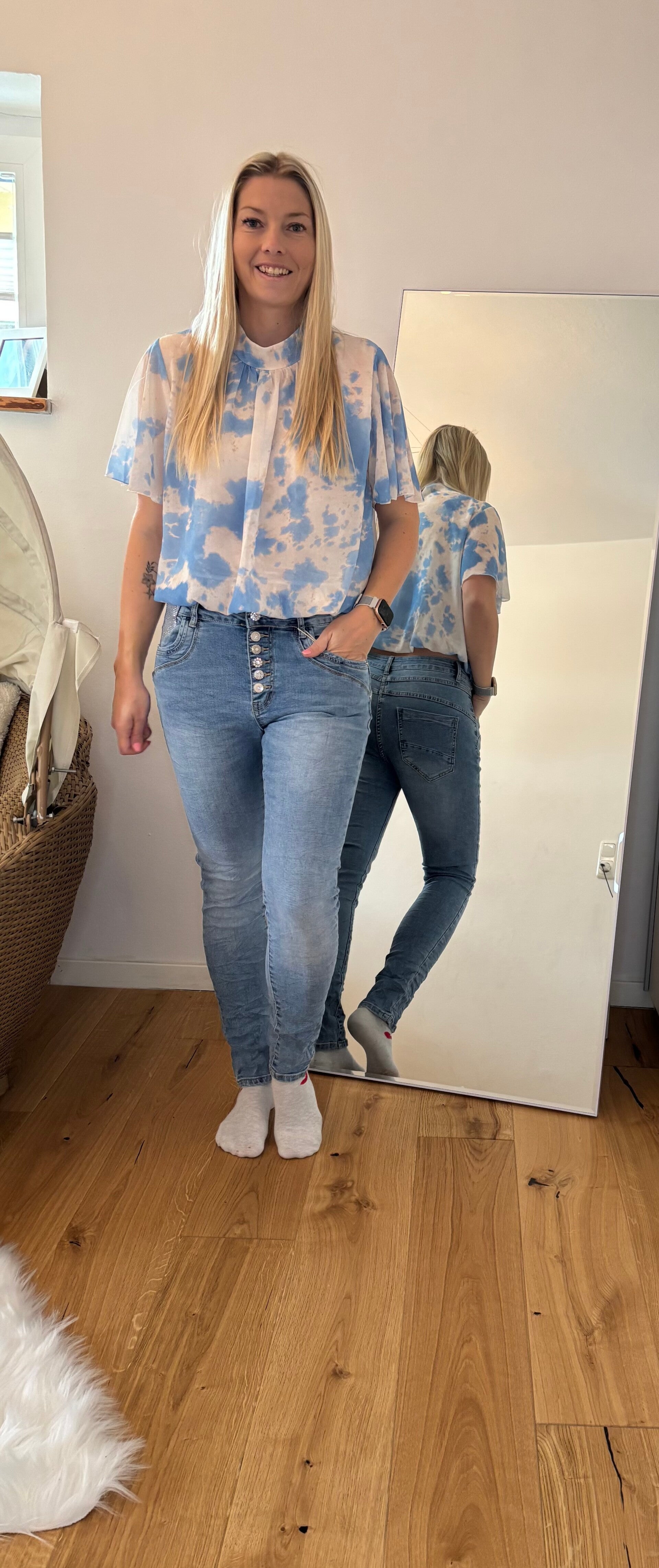 Tolle Bluse mit kurzen Ärmeln und unten am Bund mit Gummizug!