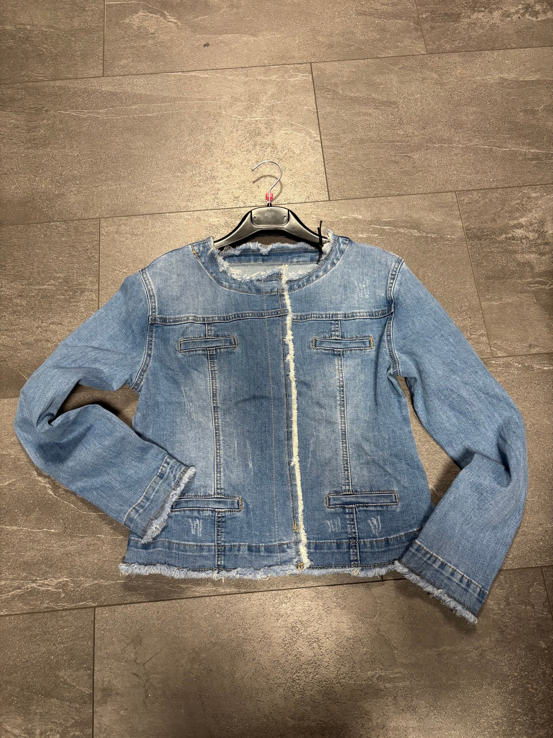 Schöne Jeansjacke mit Fransenoptik an Kragen und Ärmel.